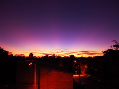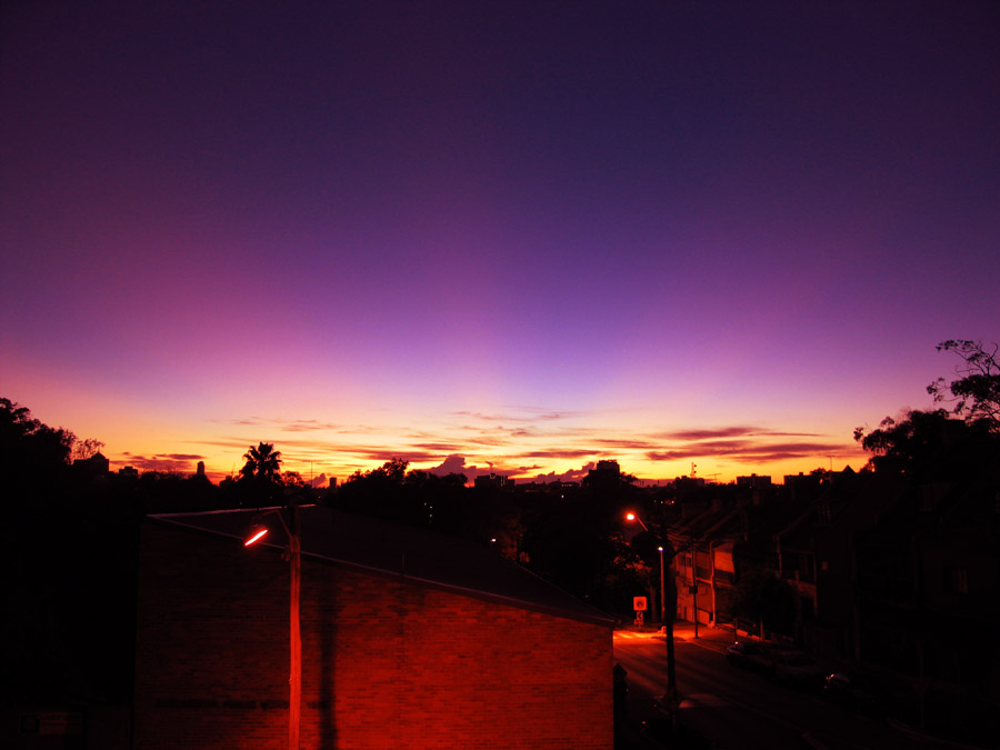 Beautiful dawn – over the eastern suburbs – layers of lightening sky over still dark and sodium lit streets and then, just faintly, three enormous fingers of light, coming from still below the horizon, beaming into the sky, like beacons – amazing.